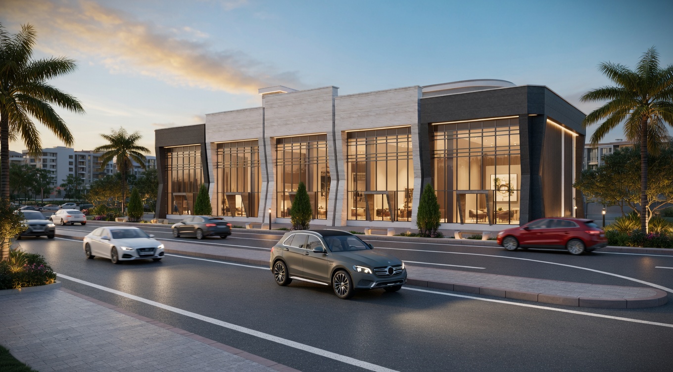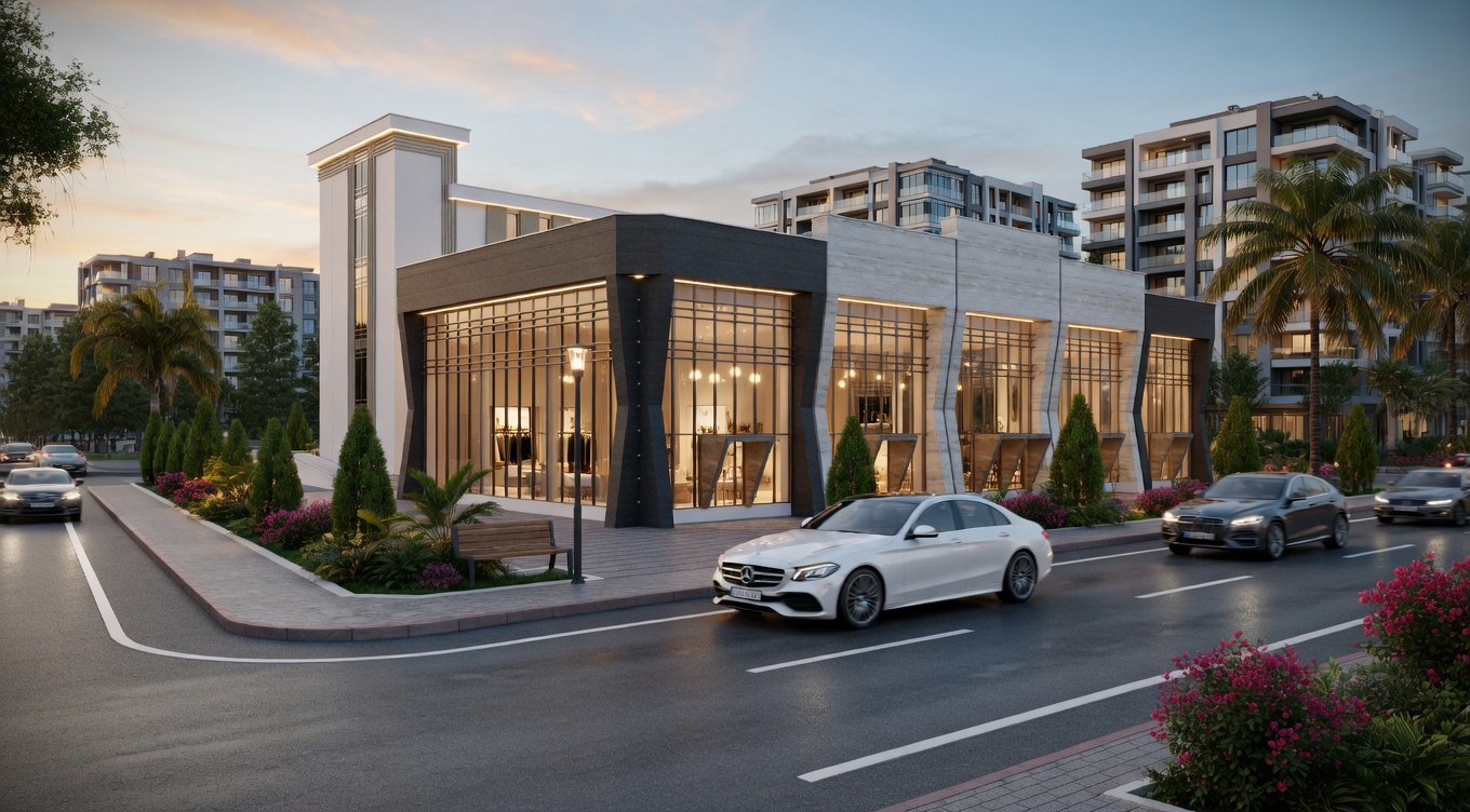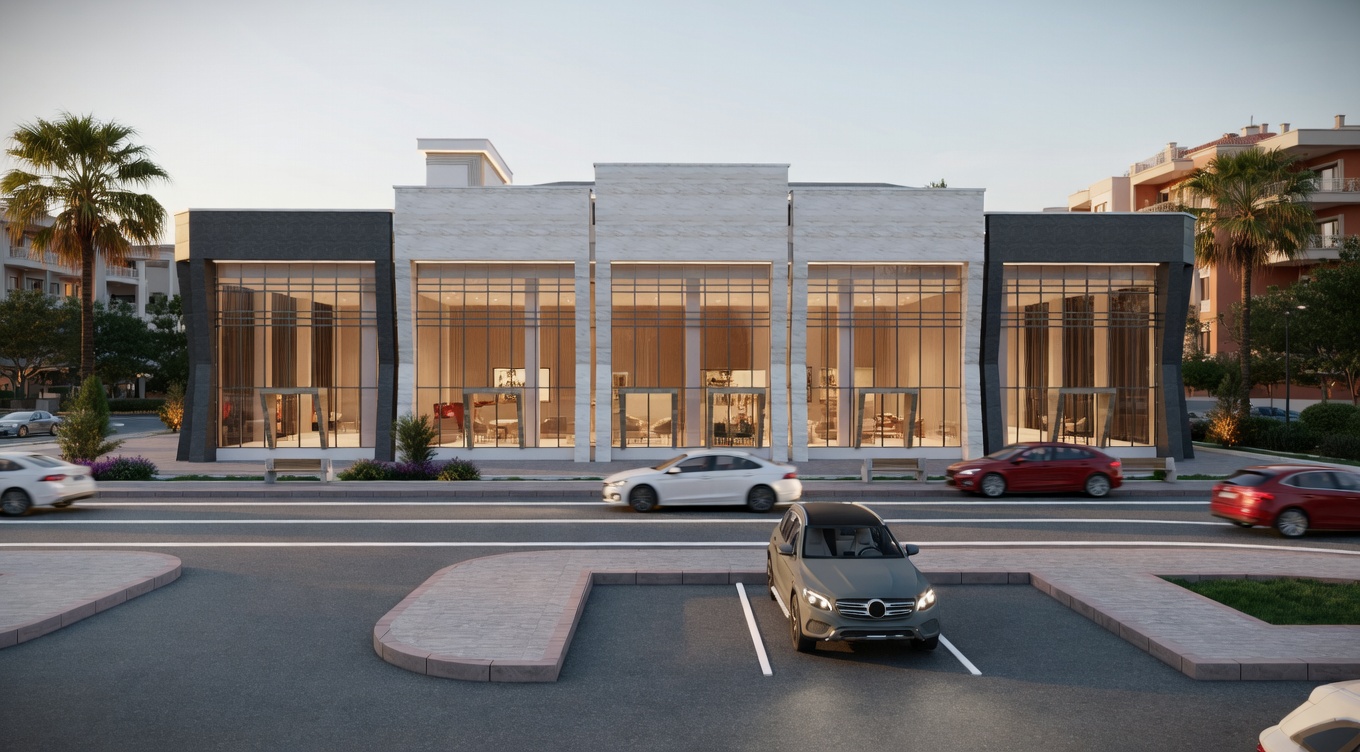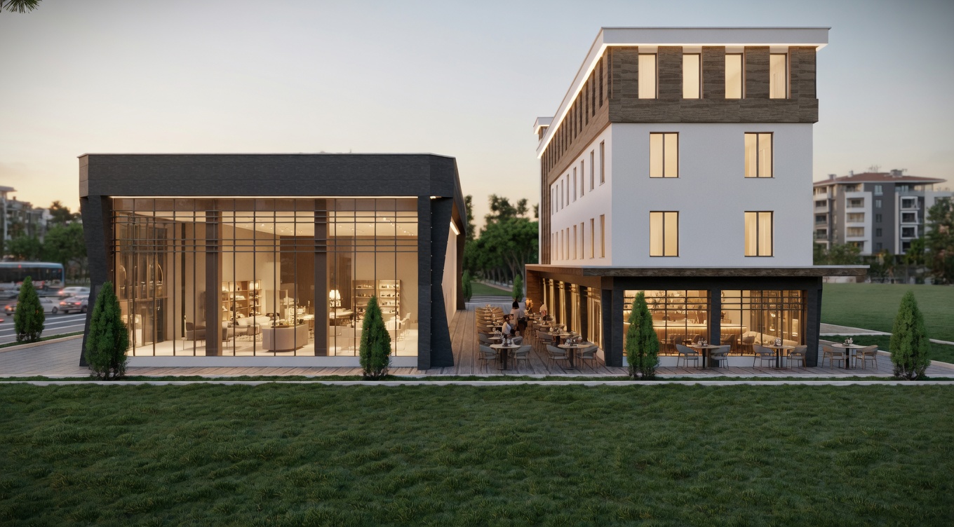 Ön blokta beş çağdaş dükkan yer alırken, arka blokta zemin kat modern bir restoran ve üst katlar premium iş merkezleri olarak tasarlandı.